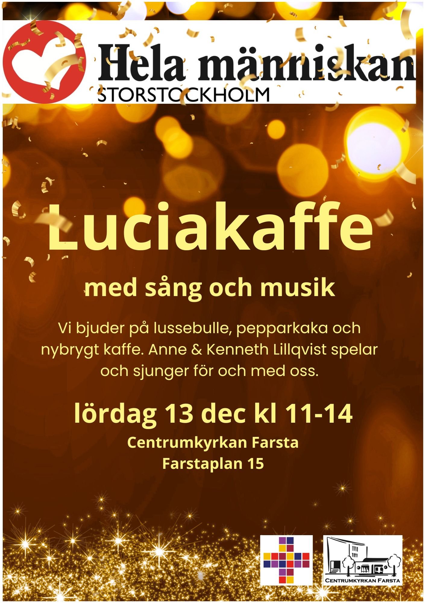 Vi bjuder på lussebulle, pepparkaka och nybryggt kaffe. Anne & Kenneth Lillqvist spelar och sjunger för och med oss. Lördag 13 dec kl 11-14, Centrumkyrkan Farsta, Farstaplan 15